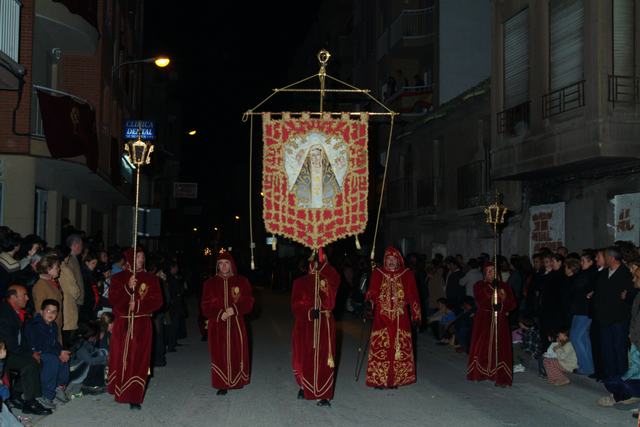 Estandarte de la Virgen de la Soledad y faroles, acompañada de mayordomos y tercio de nazarenos. El estandarte de la Virgen de la Soledad que realizado en los talleres del Paso Encarnado, bajo la dirección de Eduardo Montesinos Pérez-Chirinos, está realzado en oro y seda. El motivo central del mismo es una representación de la Santísima Virgen de la Soledad en seda. Una característica de este estandarte es su forma asimétrica, que se aleja de todos los estándares de realización conocidos hasta ahora.