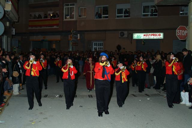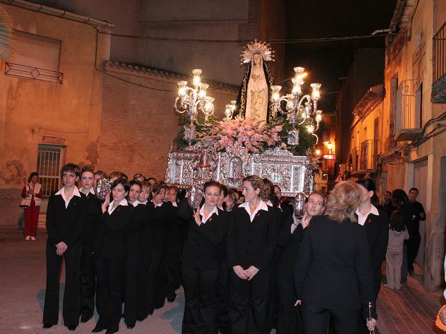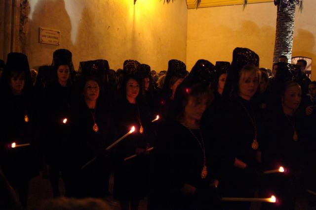 Trono e imagen de la Stma. Virgen de la Soledad, la talla de la Virgen, obra del imaginero murciano Sánchez Lozano, aparece en un precioso trono de andas de orfebrería de metal plateado de estilo neo-barroco, portada por mujeres cofrades del Paso Encarnado. Destaca su valioso y artístico manto de terciopelo negro bordado en oro con dibujo de Emiliano Rojo. Acompañan al trono, las Damas de la Asociación ataviadas con la clásica mantilla española.