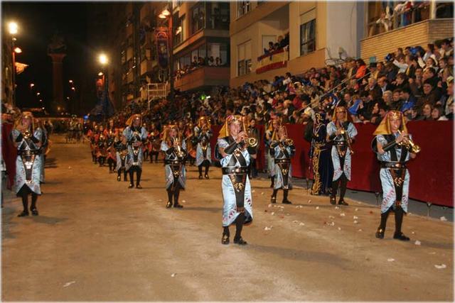 Infantería y Banda egipcia: Este grupo está formado por un capitán, tres tenientes, siete lanceros y 33 músicos. Visten tunicelas en raso celeste y granate, bordadas con sencillos motivos de inspiración egipcia y se rematan con un tocado llamado papavelina.