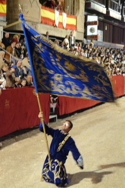 Bandera: Al son de las “Caretas” (el himno del Paso), la Bandera Azul bordada en oro y sedas con el símbolo del Paso Azul (el corazón atravesado por la espada en su anverso) y el anagrama de María en su reverso, que ahonda en el carácter mariano del Paso, desfila siendo tremolada por el abanderado, enardeciendo a los espectadores.