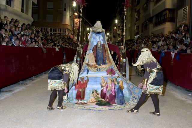 Moisés: Este personaje, que procesiona como príncipe de Egipto, aparece en biga triunfal, con un lujoso y precioso manto bordado en sedas. En la parte superior aparece Moisés recogiendo la “Tablas de la Ley” y en la inferior aparece de niño en el momento en que su madre adoptiva lo recoge del Nilo.